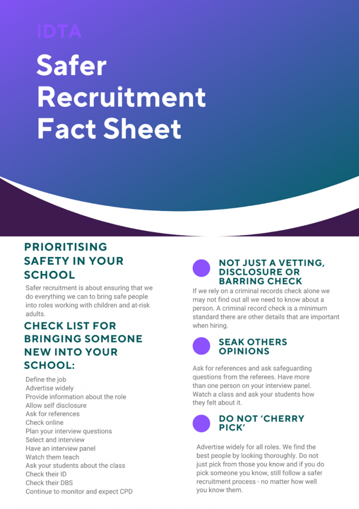 The IDTA safeguarding policies can be found here: Safeguarding – International Dance Teachers Association. If you would like to demonstrate your commitment to safeguarding and safer recruitment in your school you can use posters from the government such as these to do so. Safeguarding for providers of extra-curricular clubs, youth organisations and study groups – GOV.UK